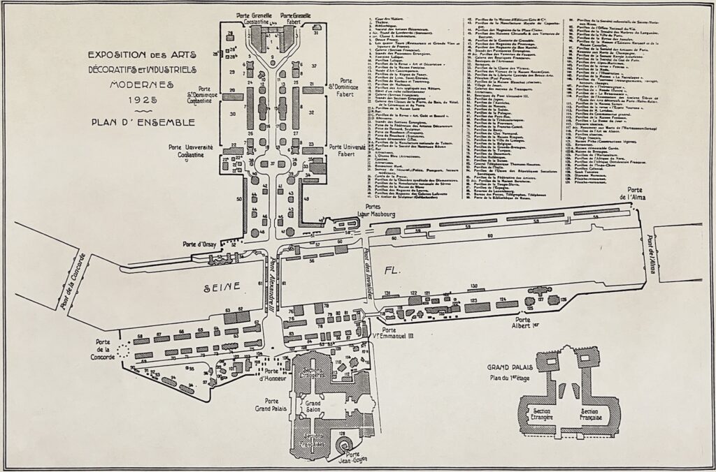 Fig 1. Plan över utställningsområdet i Paris 1925. Publicerad i Guide Album de l’Exposition Internationale des Arts Décoratifs et Industriels modernes, Paris: L’Edition Moderne, 1925,