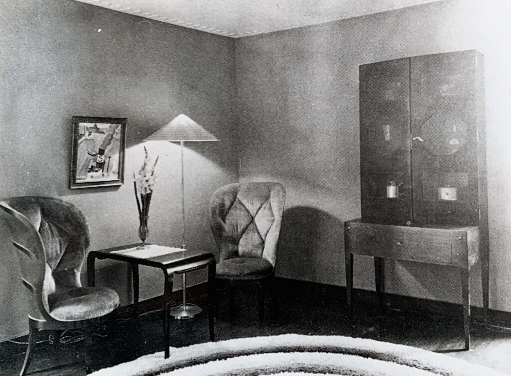 Fig 6. Interiör från svenska paviljongen med Carl Hörviks möblemang. Publicerad i Svenska Slöjdföreningens tidskrift (1925), s 64. Foto: Svenska Slöjdföreningen.