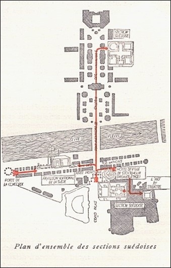 Fig 3. Plan över utställningsområdet i Paris 1925, med de svenska avdelningarna markerade. Publicerad i Exposition Internationale des Arts Décoratifs et Industriels modernes à Paris 1925: Section de la Suède: Guide illustré, Stockholm: Lagerström, 1925.