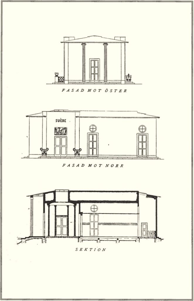 Fig 4. Ritningar till den svenska paviljongen i Paris 1925, ritad av Carl Bergsten. Publicerade i Byggmästaren, 1925, s 140.